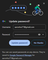 If you did not intentionally change your password, you may have typed something in another field that the browser thinks it is a password and prompts to change the password to that. You should click the X or No thanks. Unless you know for sure you are entering a new password, then click Update password. This is to avoid losing the correct password stored in the password manager. *If needed, you can usually do “Forgot Password” to fix it later.